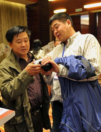 ?与会代表现场交流摄影技巧。本版图片均记者 左鸣远 实习生 马 楠 摄