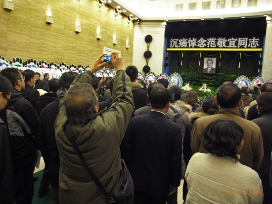 参加范敬宜先生的遗体告别仪式的群众展示范敬宜先生的生平照片。