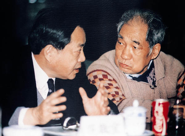 1998年春节前夕,中国新闻摄影学会第一任会长蒋齐生与第二任会长范敬宜在交流研究学会工作。