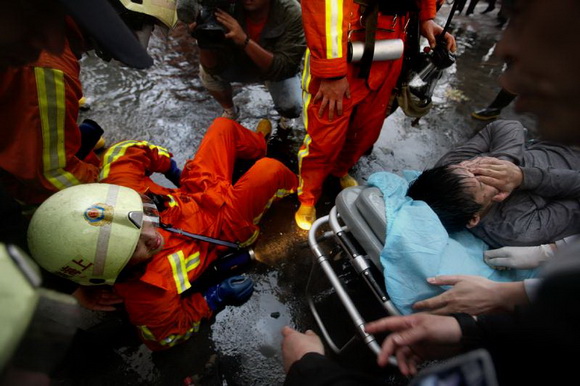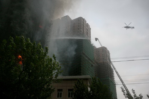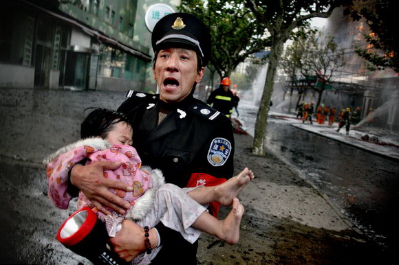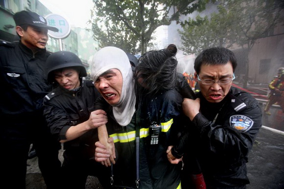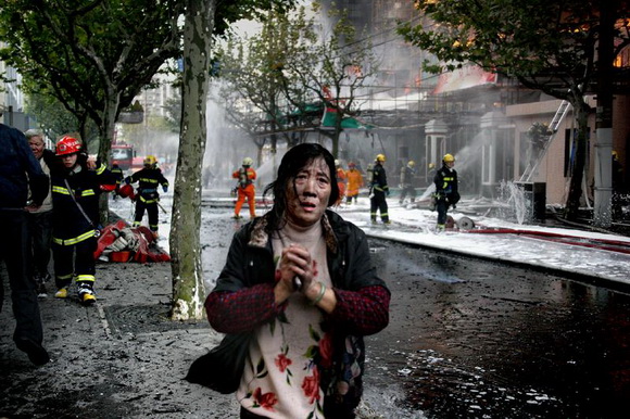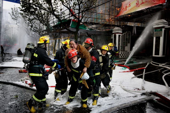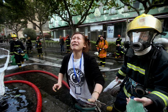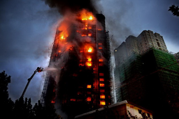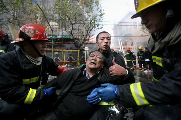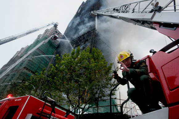2010年11月15日14时16分,上海静安区一幢高层公寓因电焊工违章动火引发特大火灾,造成居民58人死亡,百余人受伤。这是上海乃至全国高层建筑有史以来火灾死伤人数最为严重的一次特大性灾难事故。上海消防部门出动1300多名消防官兵到场救援,成功救出160余名被困人员。目前,涉嫌犯罪的10多名事故责任人已被警方刑事拘留。图为火灾事故救援现场。