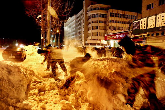 ??? 4月13日晚,武警黑龙江总队紧急出动3000名官兵行道路铲冰除雪任务。 连日来,黑龙江省部分地区遭遇暴雪袭击,给当地交通运输、农业生产和群众生活造成较大影响。