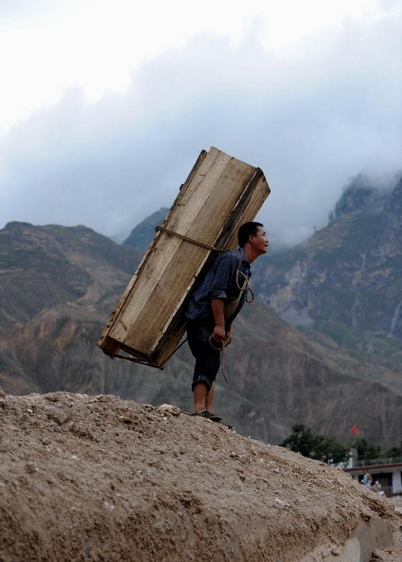 8月12日上午,舟曲县南桥村的王喜代为在泥石流灾害中遇难的外甥女做了一副棺材,一步步背到外甥女家遗址。这是他送给外甥女最后的、也是唯一的“礼物”。