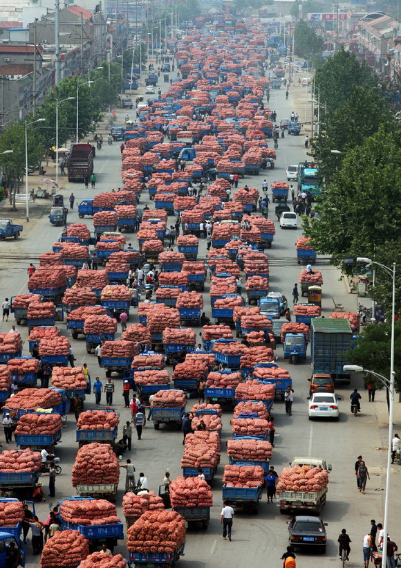 2010年6月6日,在中国最大的大蒜生产基地山东省金乡,千余辆装满大蒜的货车扎堆在南店子路等待交易,形成了一条长达2公里的马路“超市”,每天成批的经销商聚集在这条被称为“大蒜华尔街”上收购大蒜,今年,全国大蒜价格暴涨,一些省份大蒜身价短时间内就暴涨100倍,创历史新高。