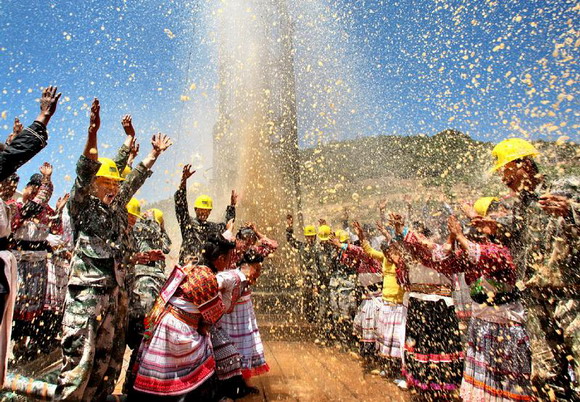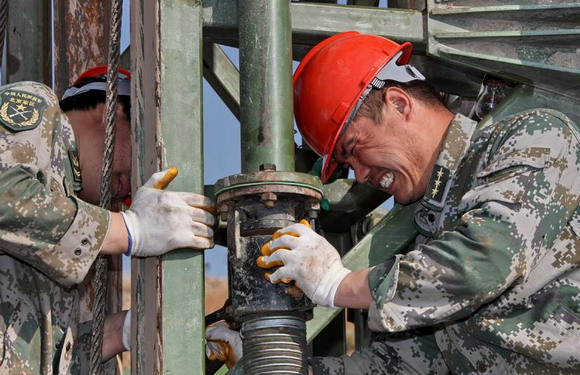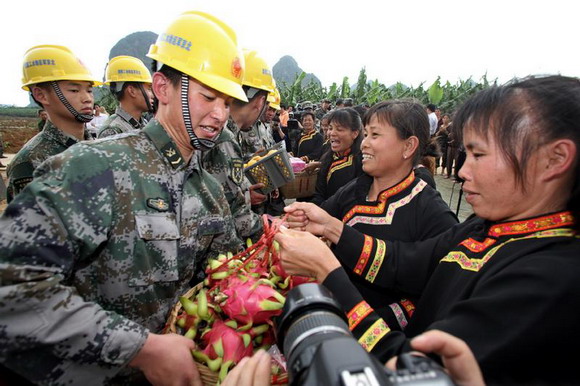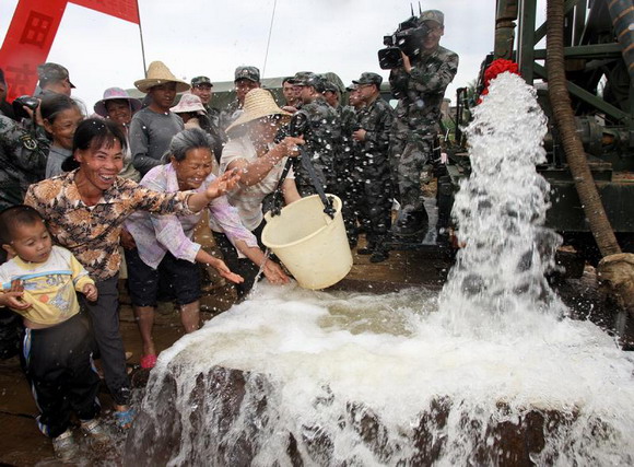 ??? 3月29日,北京军区给水工程团从内蒙古出发,经过86个小时的铁路输送,兵两分两路分赴云南、广西旱灾最严重的地区执行抗旱打井任务。该团共出动10台钻机,官兵们一到目的地就昼夜奋战,以最快的速度打井掘水,以解灾区人民之急。4月6日,一路打井队在广西田东县祥周镇模范村率先成井出水;4月7日,又在云南禄劝县屏山镇大坪地苗族村打出了一口百米深井。截至12日,给水工程团官兵共打出6眼甘泉水井。