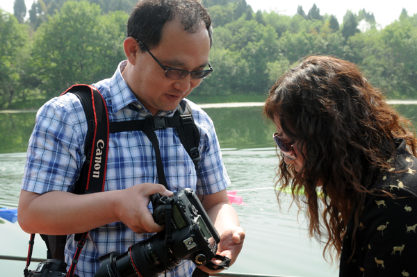 6、人民摄影报副总编辑尹玉平(左)在阆中市红军纪念园拍照。