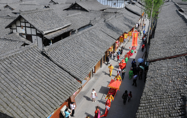 2、当地旅游部门在古城的街巷中为游客演绎古代“迎亲”的场景。