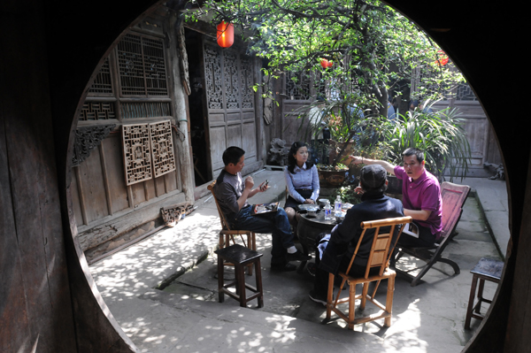 3、坐在古城中绿色成荫的小院里品茶、聊天别有一凡风味。