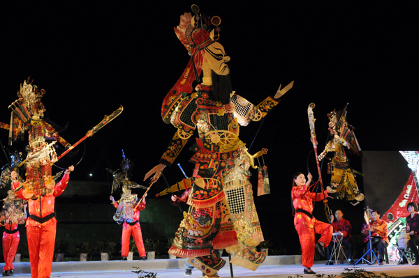 18、《我在阆中等你》文艺晚会剧照——皮影表演《桃园三结义》。王皮影又是一项在当地流传甚久的文化现象,现在又发展成皮影表演。阆中市文化和旅游局以文艺的形式演绎当地悠久的文明史,精心排练一台以反映当地各个历史时期文化文艺晚会,为前来旅游的各地客人演出。