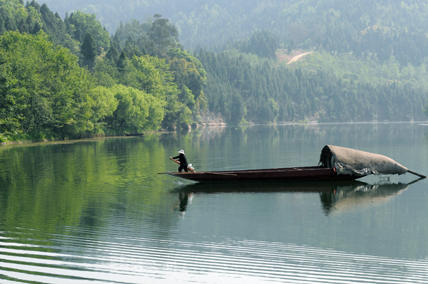 22、游船在构溪河国家级湿地保护区水面上行进,仿佛在绿树中穿行。