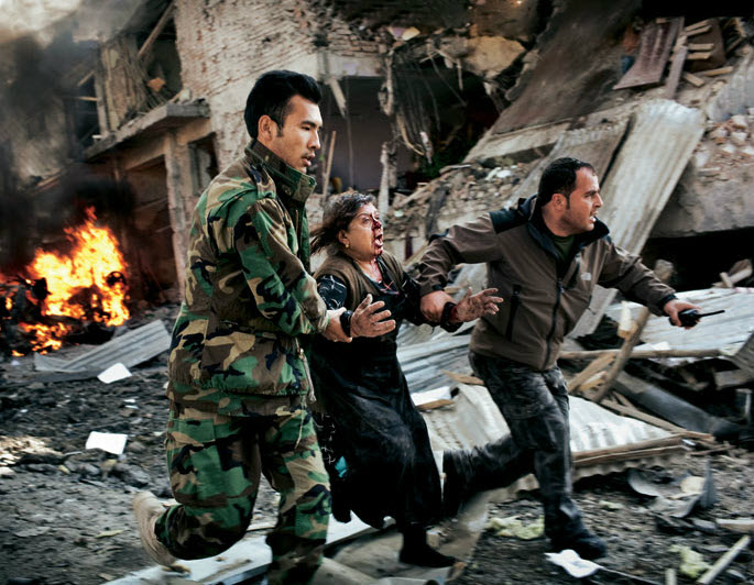 我是第一批到达现场的摄影师之一。阿富汗治安部队一如既往地迅速搞定了这类自杀爆炸现场,我得以进入爆炸中心。那儿一片狼藉,尸横遍地,火舌在建筑物的断垣残壁上肆虐。劈啪作响的火焰,断断续续的小爆炸,仍在倒塌的建筑物,我还能回忆起自己当时的害怕。硝烟还未散尽,还有出现另一颗炸弹的危险。但这样的情况并不是第一次发生,你必须将恐惧放到一边,将注意力集中在手上的工作:关心事件进展并翔实记录。