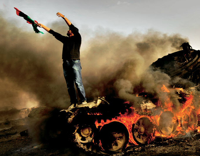 艾季达比耶被攻陷后,我迅速赶往当地。起义军占领了那儿,群众开始狂欢,朝天鸣枪??ㄔ朴祷ふ叩氖灞榈囟际牵孀湃胀芳蜕⒎⒊龈艿囊煳?。坦克上燃烧着熊熊大火,我很担心它随时会发生爆炸。突然有一个人跳上了这辆正在燃烧的坦克。我对坦克没有兴趣,但这个人吸引了我。我希望表现出每个人重获新生时的那种喜悦感,而一幅恰好吻合的画面就这样突然出现在我的面前。我尽可能靠近,离坦克只有几米距离,开始狂拍一气。脑中默数到五,立马转身就走。我见到了太多四分五裂的尸体,而我并不想变成那个样子。我来这儿是为了讲述故事,我必须这么做,这是我前往此地的原因,但我并不能让自己太过贪婪。