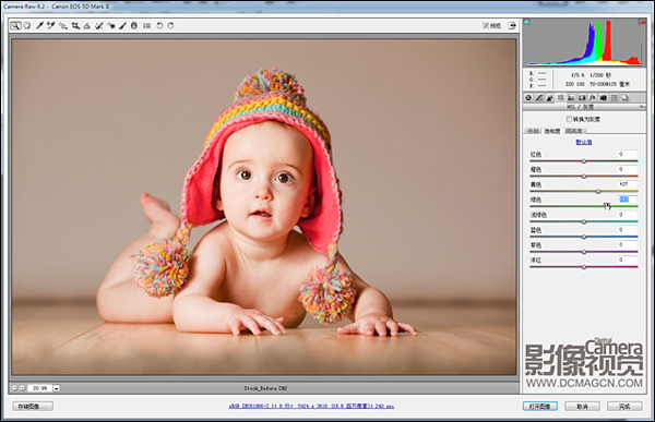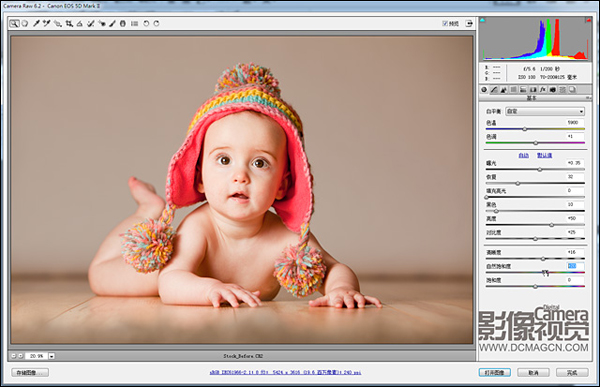 影调的调整到此告一段落。接下来将自然饱和度提高至+20,加强画面的色彩表现。同时还可以将色温设置值提高200到500,给画面增加一丝暖意,同时也让肤色显得更加健康,表现出婴儿柔嫩的肌肤。