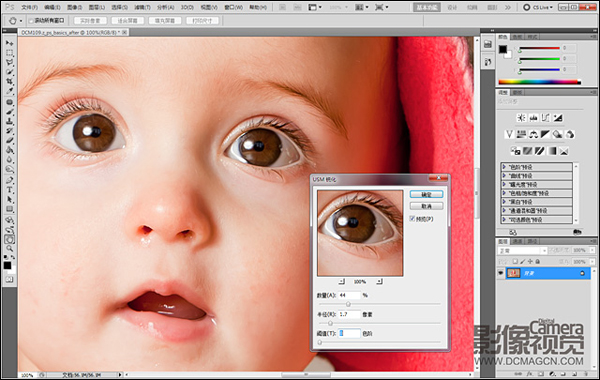重新打开“大尺寸”文件,放大至100%,选择“滤镜>锐化>USM锐化”,将数量设置为44%,半径1.7,适当增强画面细节。然后打开“中尺寸”文件,由于这幅照片比较小,因此将数量缩减至22%以避免锐化过度。