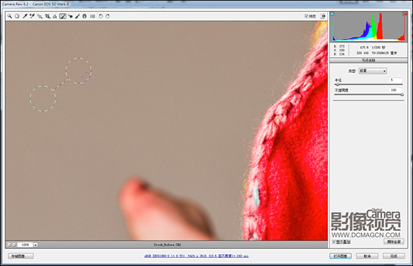 选择污点去除工具,使用快捷键“[”和“]”将画笔尺寸设置至与污点尺寸大小相当,类型设置为修复。在污点上单击后,ACR会自动选择相似画面作为取样点遮盖瑕疵。如果对自动选择的修复点不满,也可以手动修改。