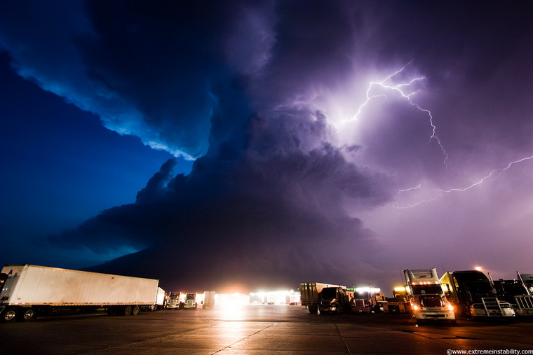 2009年6月17日,霍林谢德(Mike Hollingshead)说:“这张照片是在晚上拍摄的。当时我看到3个龙卷风纠缠在一起,冲向一个卡车停车场?!?/p>
