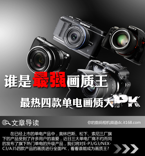 由于受日本海啸的影响,2011年上半年得数码相机市场比往年要冷清许多,就在人们翘首企盼下半年的数码相机市场何时能够复苏的时候,几大单电厂商突然开始纷纷发力,接二连三的发布了各自旗下的单电升级产品,使得数码相机市场再度火热起来,并且立即展开了白热化的战争。在已经上市的最新的单电产品中,广受好评的奥林巴斯、松下及索尼三厂旗下的单电产品成为了众人关注的焦点,当然也免不了被拿来做比较,本次我们将仅对这四款热门单电产品的画质表现进行全面PK,究竟谁能最终获胜咱们实测说了算。
