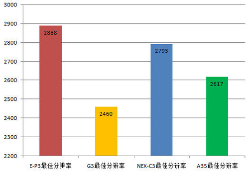 在分辨率测试中四款产品均配合各自的标准定焦头进行测试,E-P3配合了17mm F2.8镜头、G3配合了20mm F1.7、NEX-C3配合了16mm F2.8、A35配合了50mm F1.4,我们在同一测试环境中拍摄ISO12233两倍分辨率标板,以下是Imatest根据得出的四款单电相机最佳分辨率的数据。四款单电产品中分辨率表现最佳的是奥林巴斯E-P3,其次为索尼的NEX-C3。