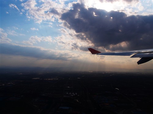 飞机起飞时拍摄窗外的景观,相机的测光比较准确,保证亮部不过曝,同时也体现出了光线从云层中射出的线条↓
