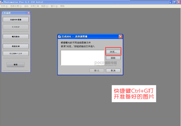 我用的制作HDR的软件是photomatixpro,首先打开软件,用快捷键Ctrl+G,打开刚才编辑好曝光的三张图片。