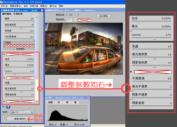 参照图片右侧对话框数值调整参数,但是参数不可死记硬背,要根据图片不同,调整到满意为止。