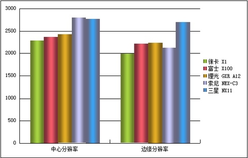 在画质测试过程中,我们分别拍摄了5台相机在各档光圈下的锐度测试样本,为方便对比我们选择了每款相机的最佳锐度光圈下的值进行比较。由于三台紧凑型DC均为定焦相机,为缩小测试差异其中索尼NEX-C3使用原厂16mm F2.8镜头、三星NX11使用SAMSUNG 30mm f2.0镜头,测试结果如下图所示: