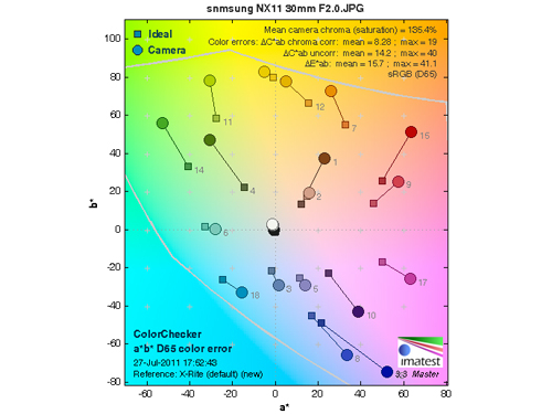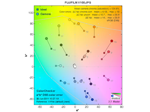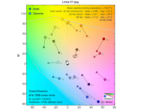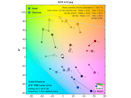 我们使用imatest软件对5台相机拍摄的ColorChecker色彩标板进行了色彩倾向性分析,结果显示如下: