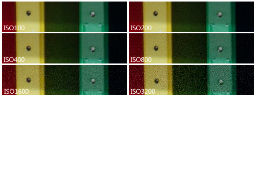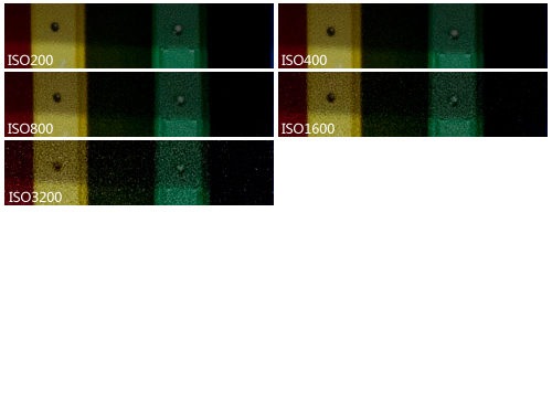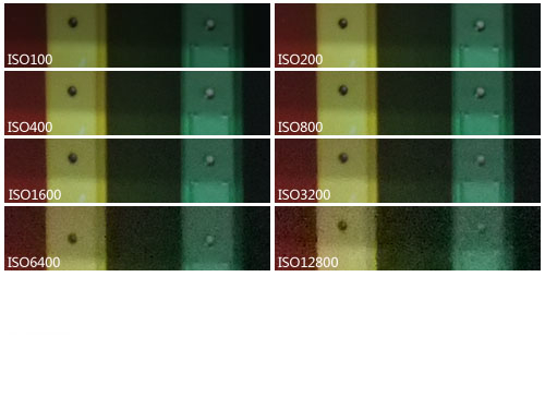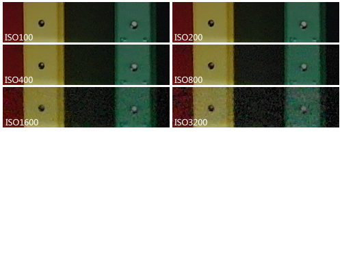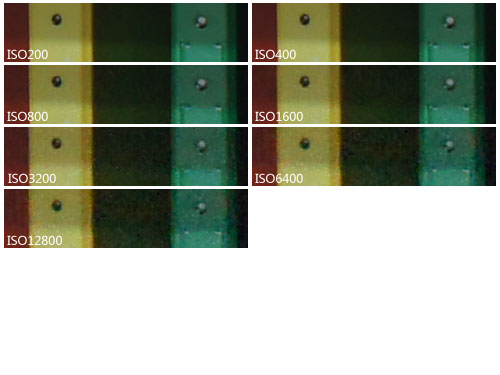 对于高感光度表现,我们拍摄同样一个场景,然后在同样一个位置对各个相机各档感光度拍摄样本进行切片,相信再多的描述不如直接看图直观。