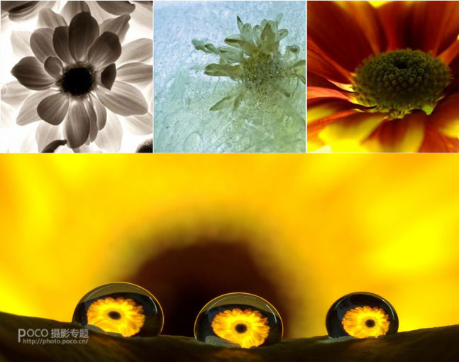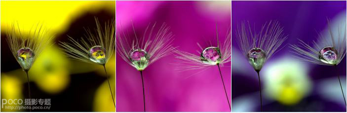 拍摄道具:相机一台,脚架,90mm微距头一支,不同颜色的花若干,台灯一盏,蒲公英的种子两颗,水滴两滴。