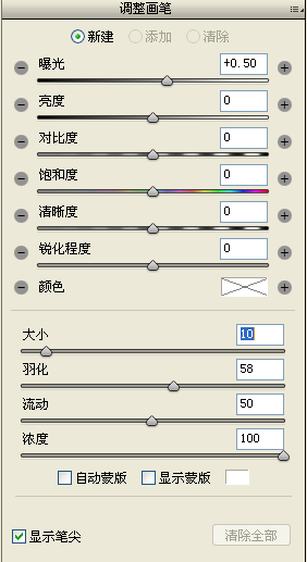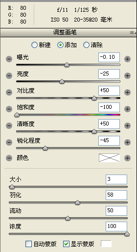 步骤2.在Camera Raw工具栏选择“调整画笔”工具,“新建”并重置参数。然后点选“显示蒙版”,对背景中山体、人物等进行去饱和的黑白处理。