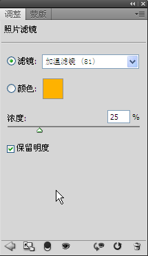 步骤9.为了更好地渲染黄昏的效果,添加“照片滤镜”,选择“加温滤镜81”,浓度设置为25%,保留明度。图片调修完毕。