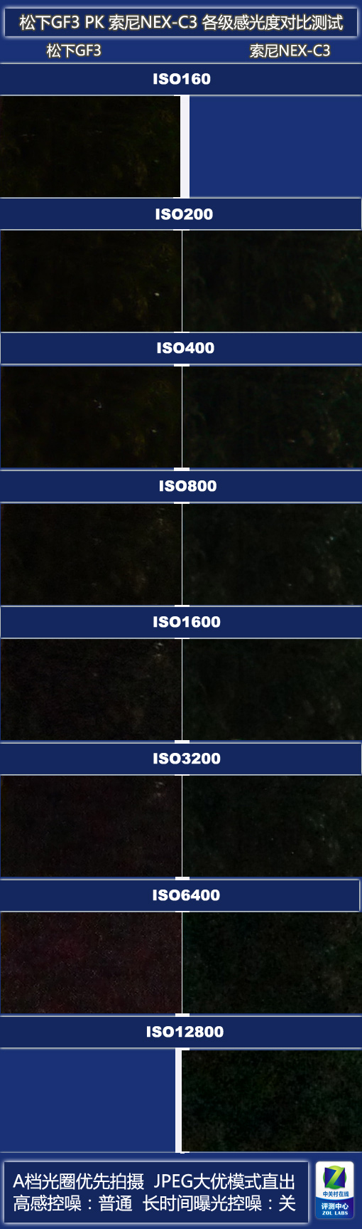在低感ISO400以下时,两台相机对于暗部区域的细节反映还不错。感光度升至ISO400后,松下GF3率先出现细节下降的情况,NEX-C3在ISO800时出现细节损失情况。ISO3200时GF3则开始出现大面积红色噪点区域,而反观NEX-C3随有噪点升高、细节下降的问题,但始终没有较为明显的杂色现象出现。
