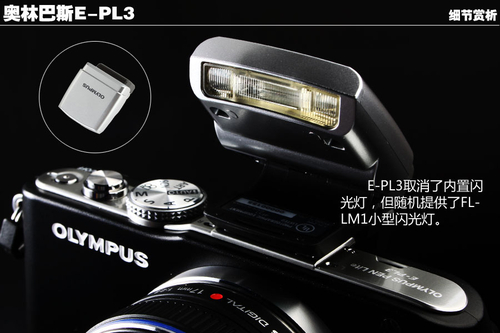 受到机身尺寸的限制,E-PL3取消了内置闪光灯,但随机提供了FL-LM1小型闪光灯(功率和E-P3内置的差不多)。该闪光灯可直接安装在E-PL3的热靴上,并通过附件端口(AP2)进行控制。