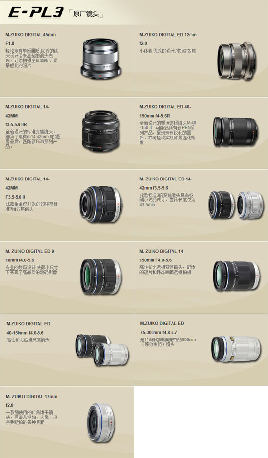 ▲E-PL3采用Micro 4/3标准卡口,目前其可使用的原厂镜头包括:(点击查看高清大图)