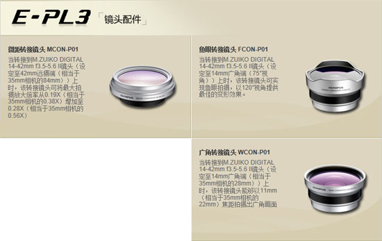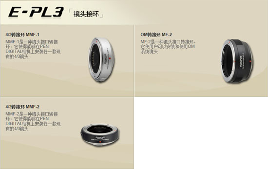 另外,E-PL3还有三款原厂的镜头接环可用,它们是: