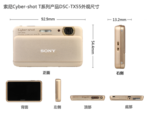 索尼TX55是目前最小最轻薄的时尚卡片数码相机产品,其经再次瘦身后的三围仅为92.9 mm x 54.4 mm x 13.2 mm ,推下镜头时机身的厚度仅为12.2mm。索尼TX55的机身重量为108g(带电池及存储卡),其不带电池及存储卡时的机身净重为仅92g,非常的纤薄。