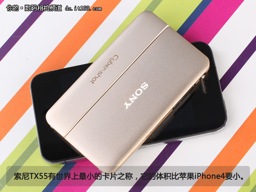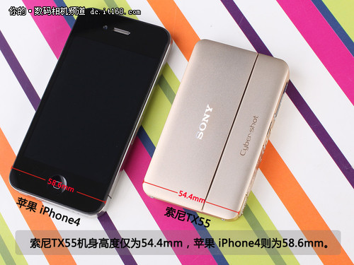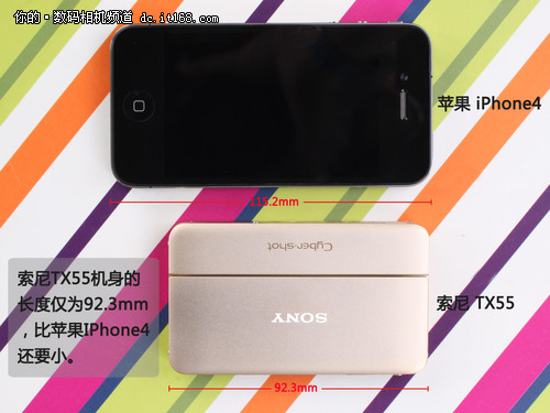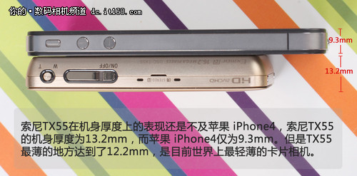 TX55到底有多???我们和目前市场上最贵的街机苹果iPhone4比比就知道了。与iPhone4相比,索尼TX55无论在机身的长度还是宽度上都要比苹果iPhone4小,只是在厚度上比iPhone4要厚,但是我们要知道TX55毕竟只是款数码相机产品。