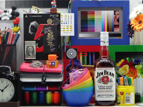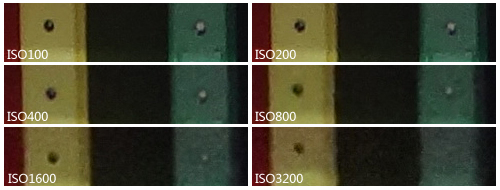 在噪点控制能力测试中,我们采用相同的设置在同一位置拍摄各档位感光度的样板柜样张,并对其进行100%截图,来观察索尼TX55各档位的信噪比表现。我们不仅比较其在画面中所呈现的颗粒感,同时也要考虑是否存在色彩漂移及是否能够很好的保留画面细节。