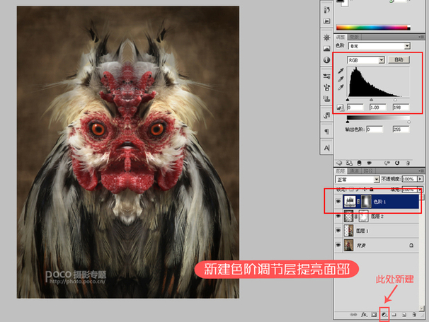 为了能更好的表现主题,我常用的方法就是削弱主题外其他东西,比如背景。这里先新建一个图层,将图层混合模式设成“正片叠底”,然后使用画笔工具“B”,前景色设成黑色,透明度40%,在图层中想要遮盖的部位涂抹,注意别涂抹鸡的脸部。如有不慎涂过不想弱化的地方可以在蒙版中擦去。