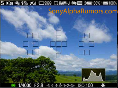 另外,海外情报网站SonyAlphaRumors取得了A77的高分辨率OLED电子取景器内容示意图,可以看出有19个自动对焦点,推测中部十字排列的11点都为十字型AF感应器。同时,画面上下缘有非常丰富的资讯,例如内存卡可储存张数、图片格式、GPS信号强度、摄像格式、电池信息等。如果电子取景器分辨率真的高达XGA等级(1024×768),那么其细致程度将比松下LUMIX GH2的153万像素电子取景器还高,实际显示效果令人十分期待。