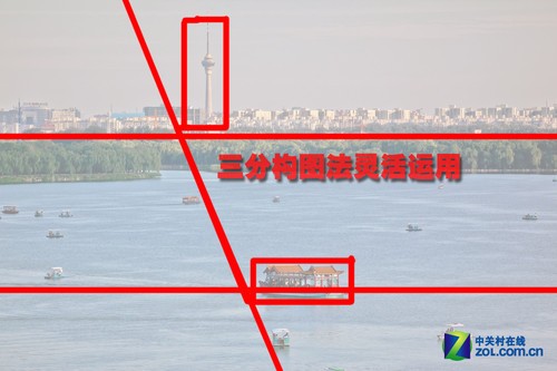 既然长焦镜头可以给人一种强烈的压缩感,如我们看到的这张照片一样。昆明湖、岸上的树、远处的中央电视塔,三者被压缩到同一个画面中。如何能让画面不显得凌乱,那么还是需要有个统一的构图安排。