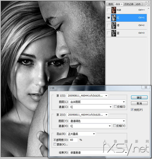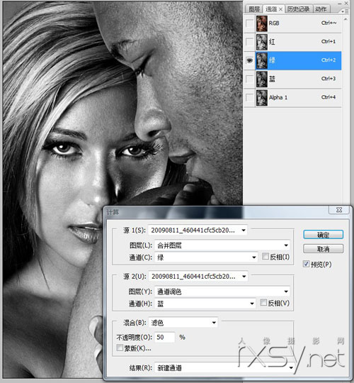 第三步,转换到通道选项里,并选择红色通道,然后应用“计算”命令,得到一个新通道1。再选择绿色通道,应用“计算”命令,得到新通道2。具体设置如图所示。然后,复制Alpha1通道粘贴到红色通道,复制Alpha2通道粘贴到蓝色通道,从而获得鲜艳的颜色效果。