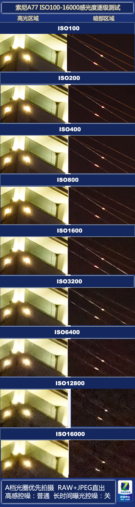 A77支持ISO50-16000感光度调节范围,其中ISO50-64为计算插值所得,相机实际的感光度调节范围是ISO100-16000。此次的感光度测试就从这一区间的实拍样片中提取样本,并进行逐级的比对。