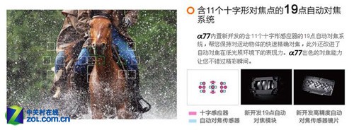 索尼在上一代产品(单电A55以及单反A580等)产品上实现了15点自动对焦。其中,对于对焦灵敏度至关重要的十字形对焦点设计了3个。而索尼这次在A77上设计的规格有了很大的提升,19点对焦系统包括了11个十字对焦点。