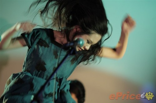 ▲图二十二:这位太太键盘手兼主唱阿牧在表演中突然一跃而起,她飞扬的头发与洋装美呆了。