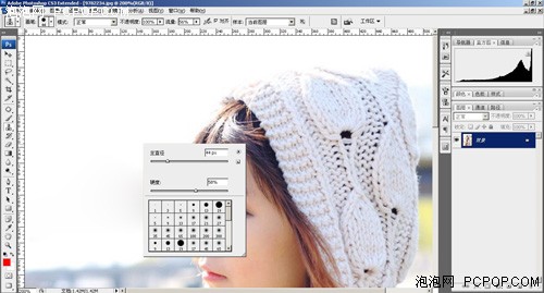 选择“仿制图章”调整相直径和硬度,在头发边缘位置按住左键一点点上下移动,要细心慢慢来