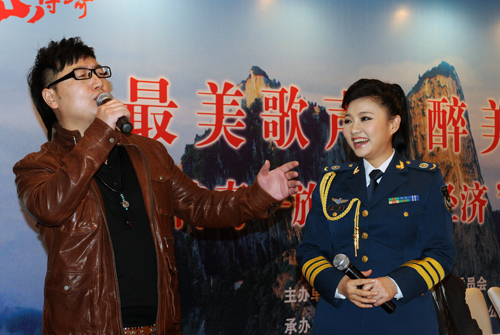 11月22日,青年歌手周鹏(左)、王莉在《华山传奇》音乐电视专集首发式上演唱歌曲《华山传奇》。当日,华山景区管委会在京举行《华山传奇》音乐电视专集首发式,著名词、曲作家张农科、孟庆云和一批青年歌手出席首发式并现场献歌。这部音乐电视专集以西岳华山文化为题材,由《华山之上》、《望华岳》、《三月三上华山》等五首歌曲组成,歌曲旋律优美、意韵悠久、大气恢弘,展示了华山的壮丽景色和精深文化。据了解,华山景区管委会正在着力打造文化带动旅游、促进经济发展的新品牌。王呈选摄影报道