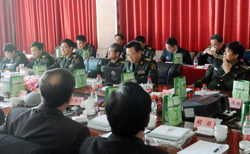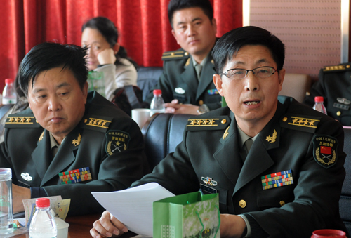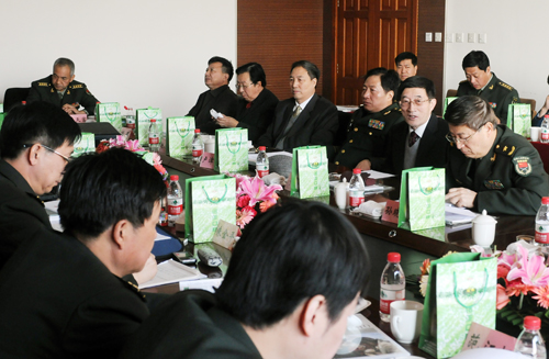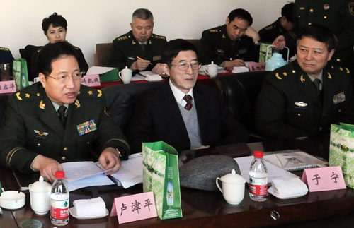 12月12日,武警政治部副主任卢津平将军(前左一)在军事摄影联络部第一次工作会上致欢迎辞。