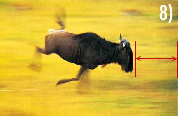 靠近边缘的裁切能带来视觉上的吸引力,但是在拍摄快速运动的动物时(比如这只非洲角马),在它的头部之前留下一定的空间是明智的选择。这样做不仅在视觉上有逻辑性,而且也能让你更容 易地拍摄到动物的全貌。