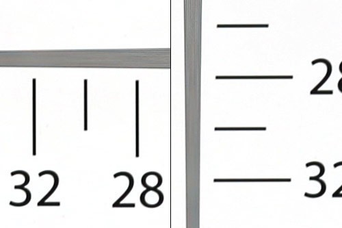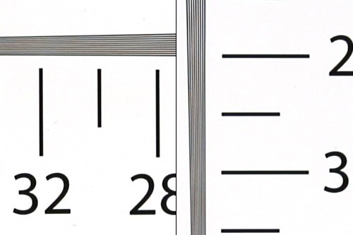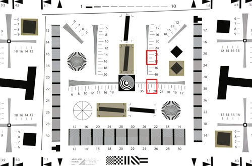 佳能EOS 5D MarkIII有效像素升级为2230万,市售套机仍旧配备EF 24-105mm镜头,因而在分辨率测试环节,我们使用24-105mm镜头测试其在广角和长焦端的成像分辨率。测试时使用光圈优先模式逐档光圈拍摄,感光度使用ISO100,配合三脚架并延时稳定拍摄。分辨率测试标板为ISO12233分辨率测试扳,我们分别截取横向与纵向分辨率进行读值。