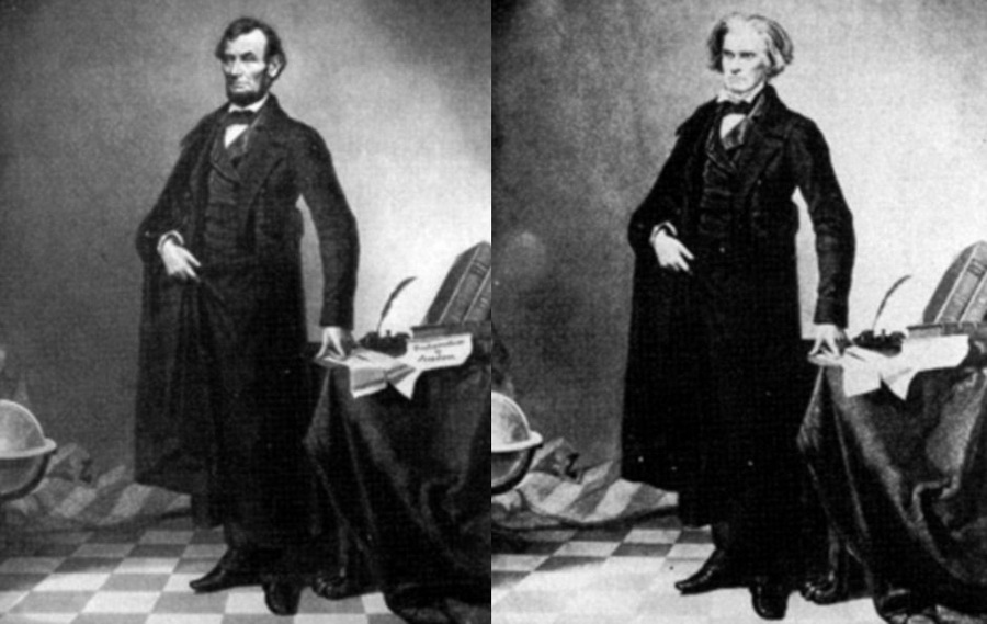 左边的假照片是用美国前总统林肯的头像替换了右边照片中美国南部政客约翰 C 卡尔豪的头像。